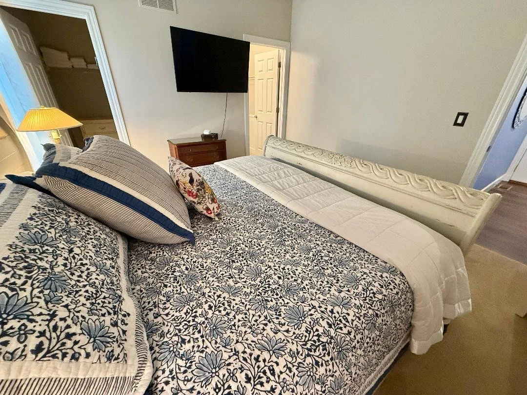 The first floor has 2 master suites each with king beds, large walk-in closets and large screened TVs. No cable TV service in this home. Feel free to bring a personal streaming device to hook up if preferred. There are 2 ½ baths on the first floor along with a lovely laundry room. Stainless steel appliances in the laundry and kitchen make a fresh look. The kitchen is well appointed with all the amenities. Upstairs are two more bedrooms that each have a queen bed and a single bed with large closets and views of the lake. There is a large full bath on the upper floor. Return to ALL RENTALS >>>
